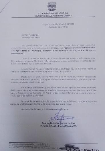 - PROJETO DE LEI MUNICIPAL Nº 004/2023: O Poder Executivo concede desconto extraordinário para os agricultores do município, alterando a Lei Municipal nº 720/2019. Aprovado