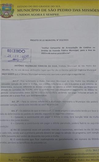 - PROJETO DE LEI Nº 013/2023: O Poder Público institui Campanha de Arrecadação e Créditos no âmbito da Fazenda Municipal, para o ano de 2023. Aprovado.