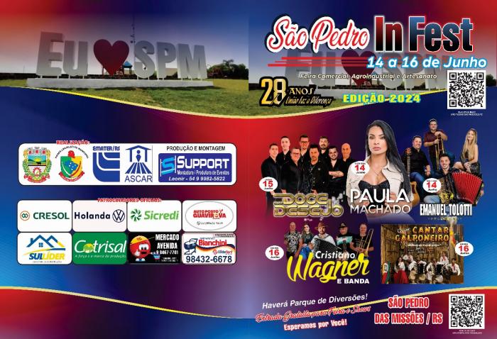 Nos dias 14 a 16 de junho, São Pedro das Missões realizará o São Pedro In Fest. Uma incrível feira que une comércio, agronegócio e artesanato, promovendo três dias repletos de entretenimento, diversão, shows, palestras e atrações culturais.