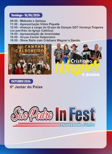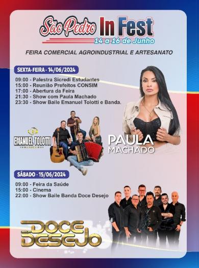 São Pedro In Fest de 14 a 16 de Junho, no Ginásio Municipal de São Pedro das Missões.