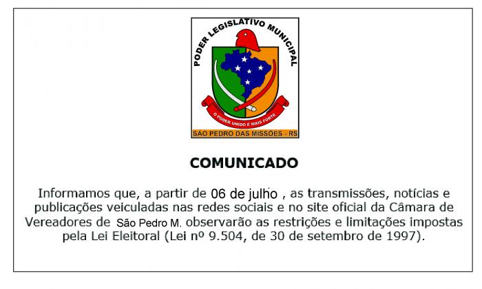 Câmara Municipal de Vereadores de São Pedro das Missões comunica toda a população que a partir do dia 6 de julho (sábado), as publicações em todas as redes sociais da Câmara (Site, Facebook e informativo de Rádio) serão suspensas, sendo retomadas a partir de 7 de outubro.