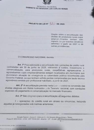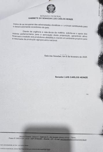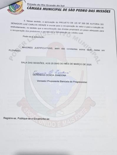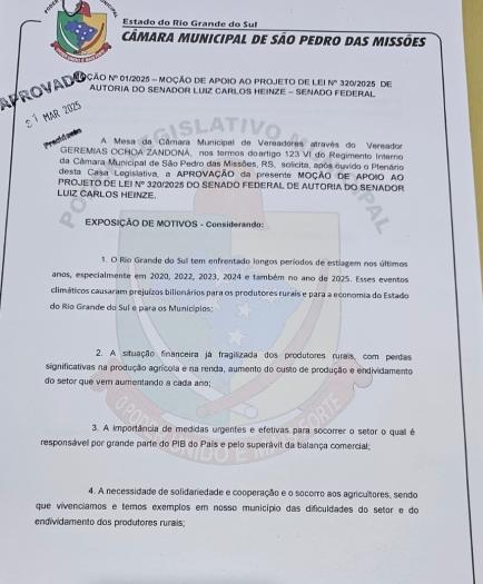 MOÇÃO Nº 01/2025: Moção de apoio ao Projeto de Lei nº 320/2025 de autoria do Senador Luiz Carlos Heinze, que dispõe sobre a securitização das dívidas de produtores rurais cujos empreendimentos tenham sido impactados por evento climáticos adversos a partir de 2021. Vereador proponentes Geremias Zandoná. Aprovado pelos demais edis.