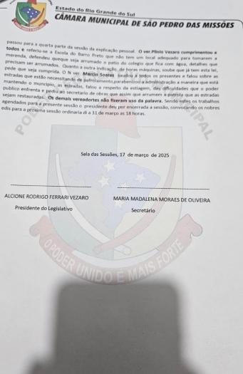 Na segunda-feira, dia 31 de março, aconteceu a 5ª Sessão Ordinária da Câmara de São Pedro das Missões. Como não havia material protocolado e houve um entendimento entre os vereadores, a sessão foi realizada de forma não presencial.