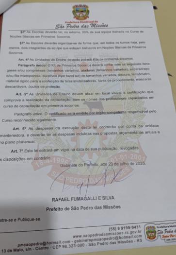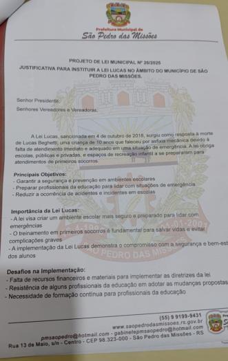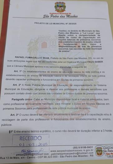 PROJETO DE LEI MUNICIPAL Nº 026/2025: Autoriza o Executivo a instituir a “Lei Lucas, que dispõe sobre a obrigatoriedade da oferta de curso de capacitação em noções básicas de primeiros socorros nos estabelecimentos de ensino infantil e fundamental, bem como a disponibilização e kits de primeiros socorres nas escolas da rede municipal de ensino. Aprovado.
