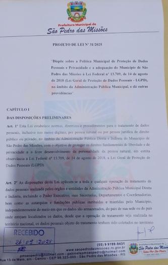 PROJETO DE LEI MUNICIPAL Nº 031/2025: Dispõe sobre a Política Municipal de Proteção de Dados Pessoais e Privacidade e a adequação à Lei Federal n º 13.709, de 14 de agosto de 2018 (Lei Geral de Proteçã de Dados Pessoais – LGPD), no âmbito da Administração Público Municipal. Aprovado.