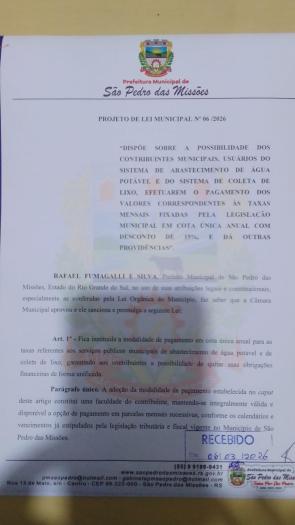 PROJETO DE LEI MUNICIPAL Nº 06/2026: Dispõe sobre a possibilidade dos contribuintes municipais, usuários do sistema de abastecimento de água potável e do sistema de coleta de lixo, efetuarem o pagamento dos valores correspondentes às taxas mensais fixadas pela Legislação Municipal em cota única anual com desconto de 15%. Aprovado.