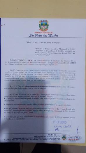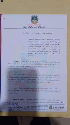 PROJETO DE LEI MUNICIPAL Nº 08/2026: Autoriza o Poder Executivo Municipal a destinar recursos financeiros no valor de R$ 150.000,00 para a realização da Semana do Município de São Pedro das Missões, denominada "São Pedro em Fest", em comemoração ao trigésimo aniversário de emancipação político-administrativa, autoriza a abertura de crédito adicional e dá outras providências”. Aprovado.